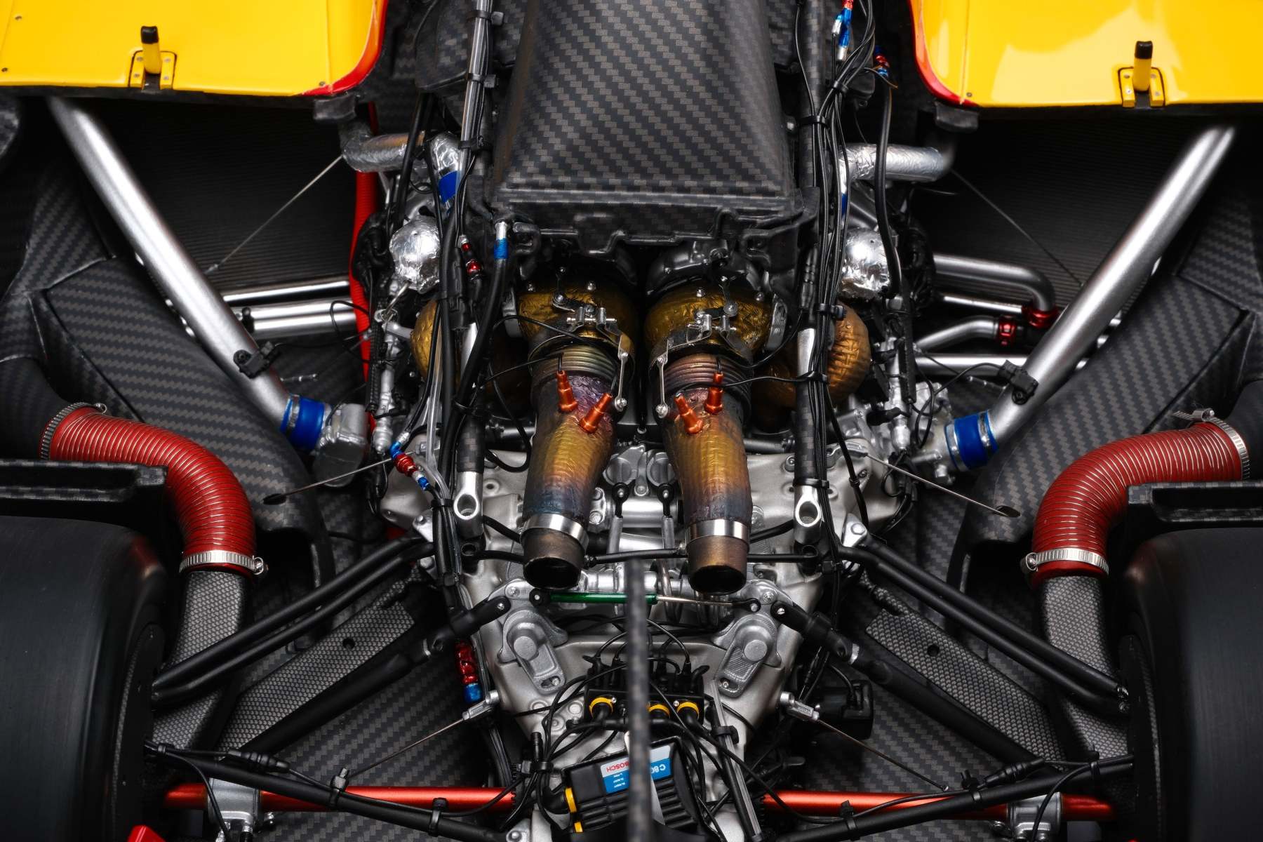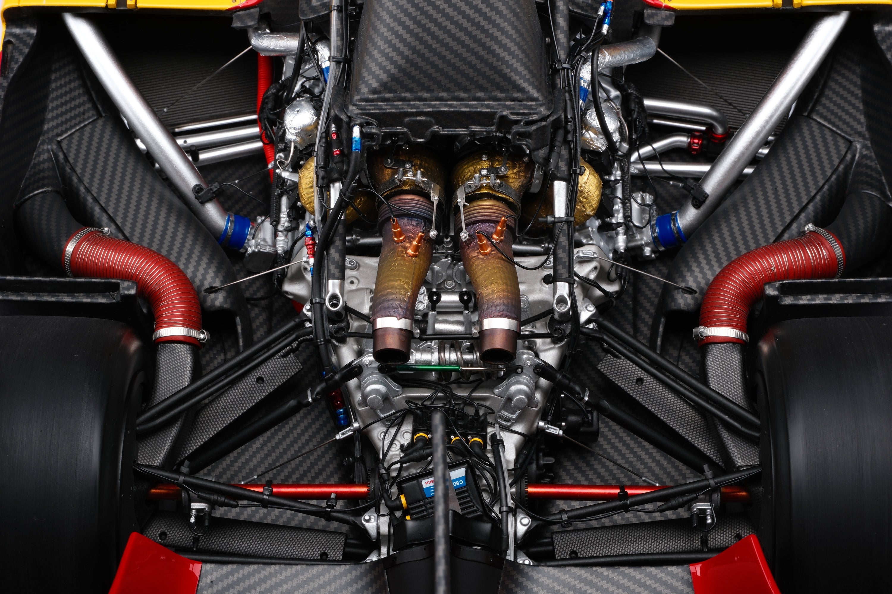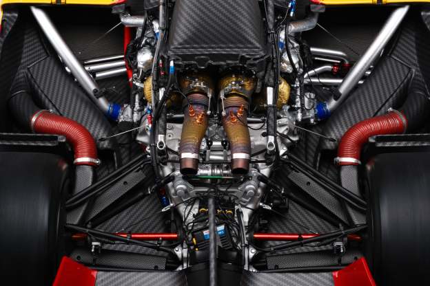 Built on an all-new carbon-fibre monocoque chassis, the 499P features solutions that represent the cutting edge of motor sport technology. Double wishbone, push-rod-type suspension provides an outstanding damping stiffness, the benefits of which are felt on the straights as well as when cornering. The electronics systems are developed from and further innovate upon the experience honed in the world of GT racing. The Hypercar features a hybrid powertrain, combining a mid-rear power unit with an electric motor powering the front axle, and is coupled to a seven-speed sequential gearbox. The 2.9-litre, twin-turbo V6 used is the same engine used in the 296 GT3 and its road-going cousins, with a maximum power output of 500kW (680cv). Added here is an Energy Recovery System (ERS) that’s connected to the front axle, and fed by a brake-by-wire system. The ERS is good for 200 kW, and the battery that powers it uses know-how accrued from Ferrari’s vast F1 experience. Among the specific characteristics of the 499P's V6 is the fact that the engine is load-bearing and therefore performs a valuable structural function, compared to the versions fitted to competition GT cars, where the engine is mounted onto the car’s rear sub-chassis.