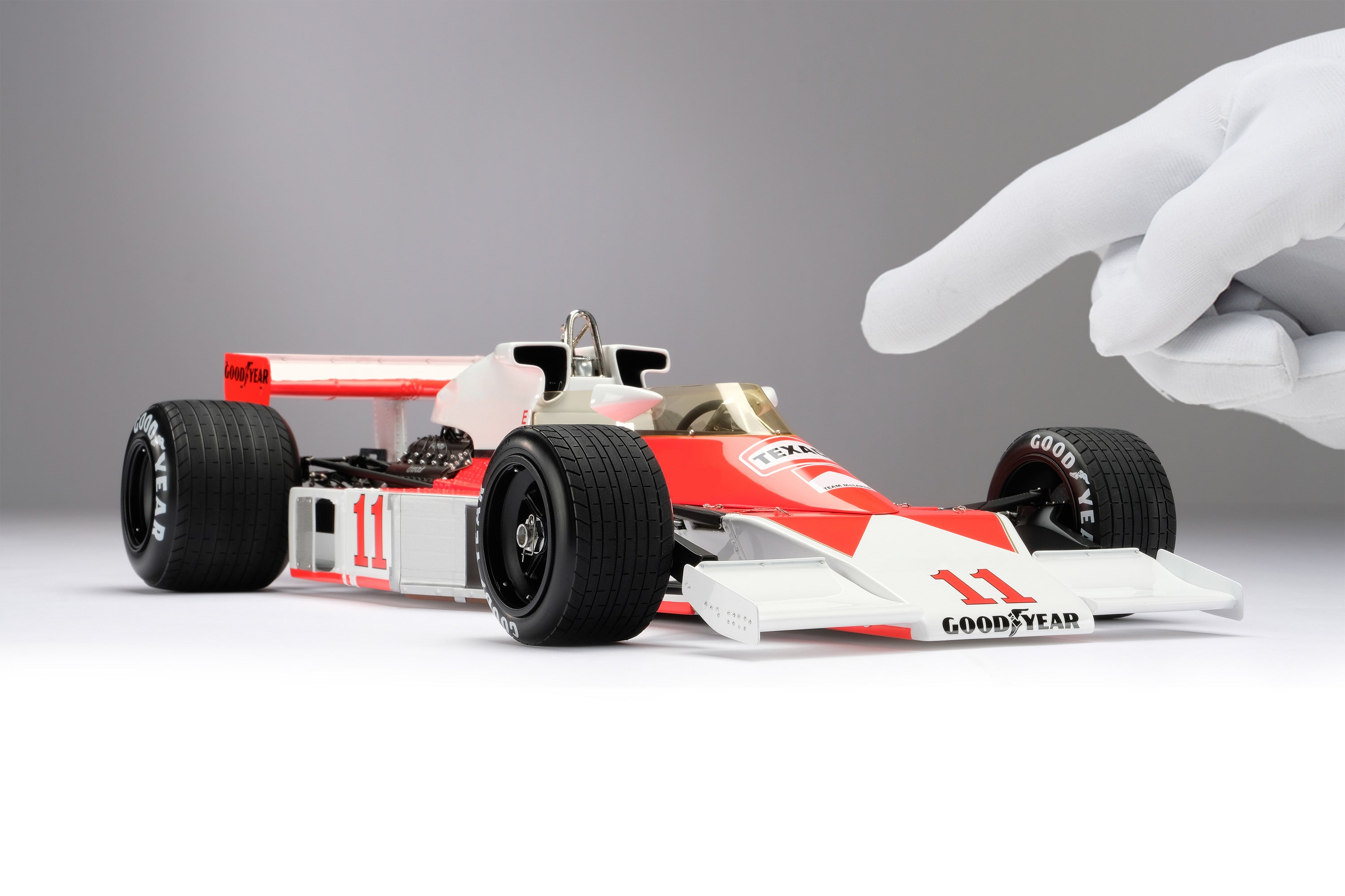 This 1:18 scale model is based on the fourth and final iteration of the M23 used in 1973, the M23D. The car was to be driven by 1974 World Champion Emerson Fittipaldi and German driver Jochen Mass, until Fittipaldi left McLaren and joined his brother's Copersucar-Fittipaldi outfit. The team management signed British racer James Hunt, who had performed well for Hesketh Racing but some doubted whether he could sustain his performances long enough to challenge 1975 champions Ferrari and Niki Lauda. It transpired to be one of the most extraordinarily dramatic and political seasons in Formula One history.