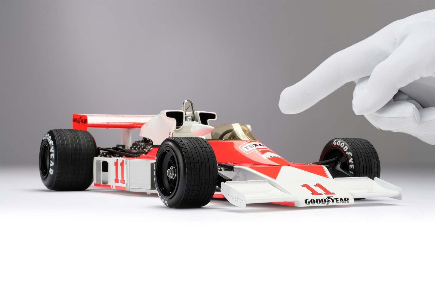 This fine 1:18 scale model of the McLaren M23D is based on the car that James Hunt raced to third position at the final race of the 1976 season at the Fuji Speedway in Japan, securing the Drivers’ Championship title. This was no mean feat, particularly given the fact that by this time the M23 was a three-year-old car, up against the might of reigning champions Niki Lauda and Ferrari.