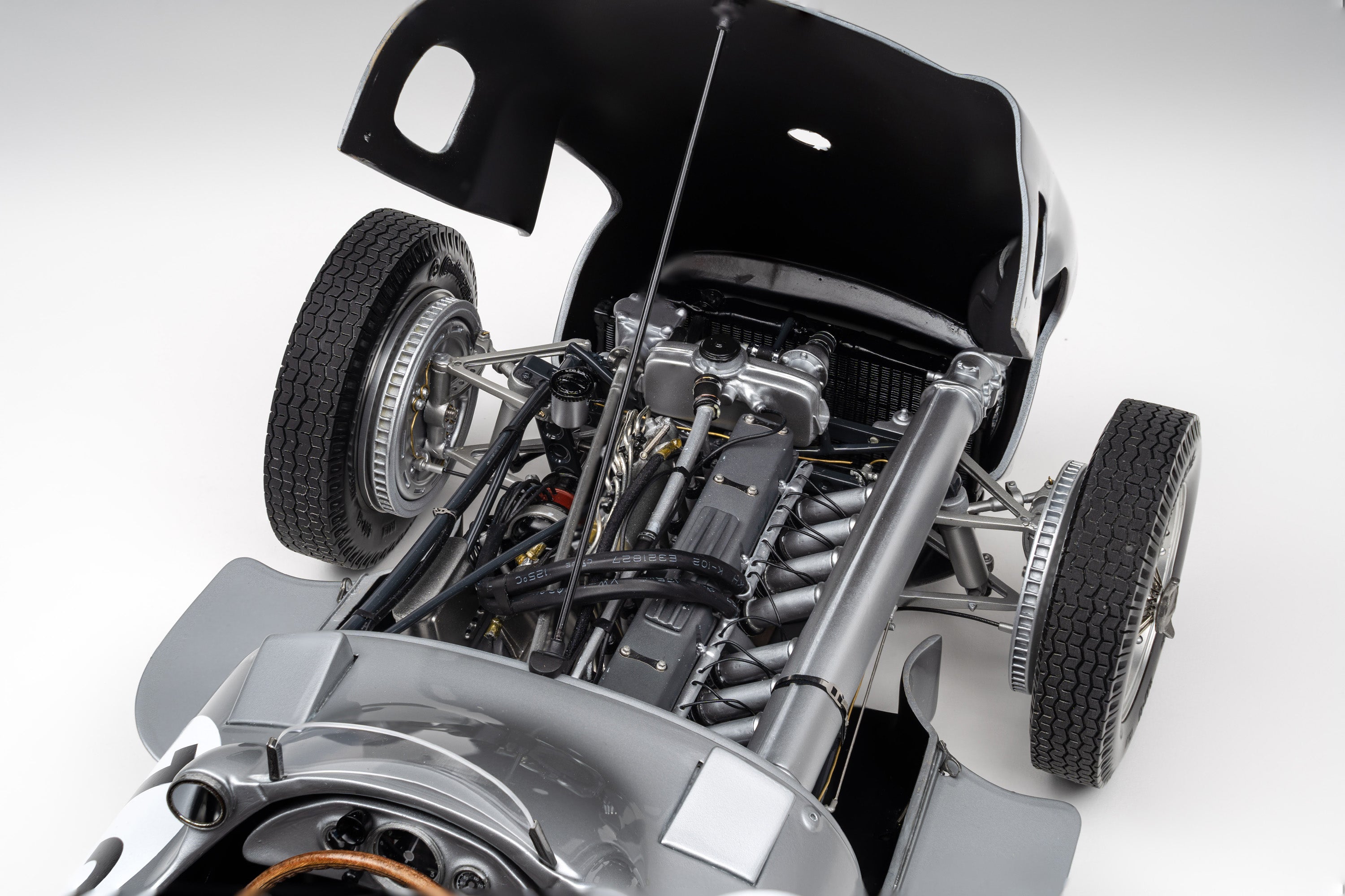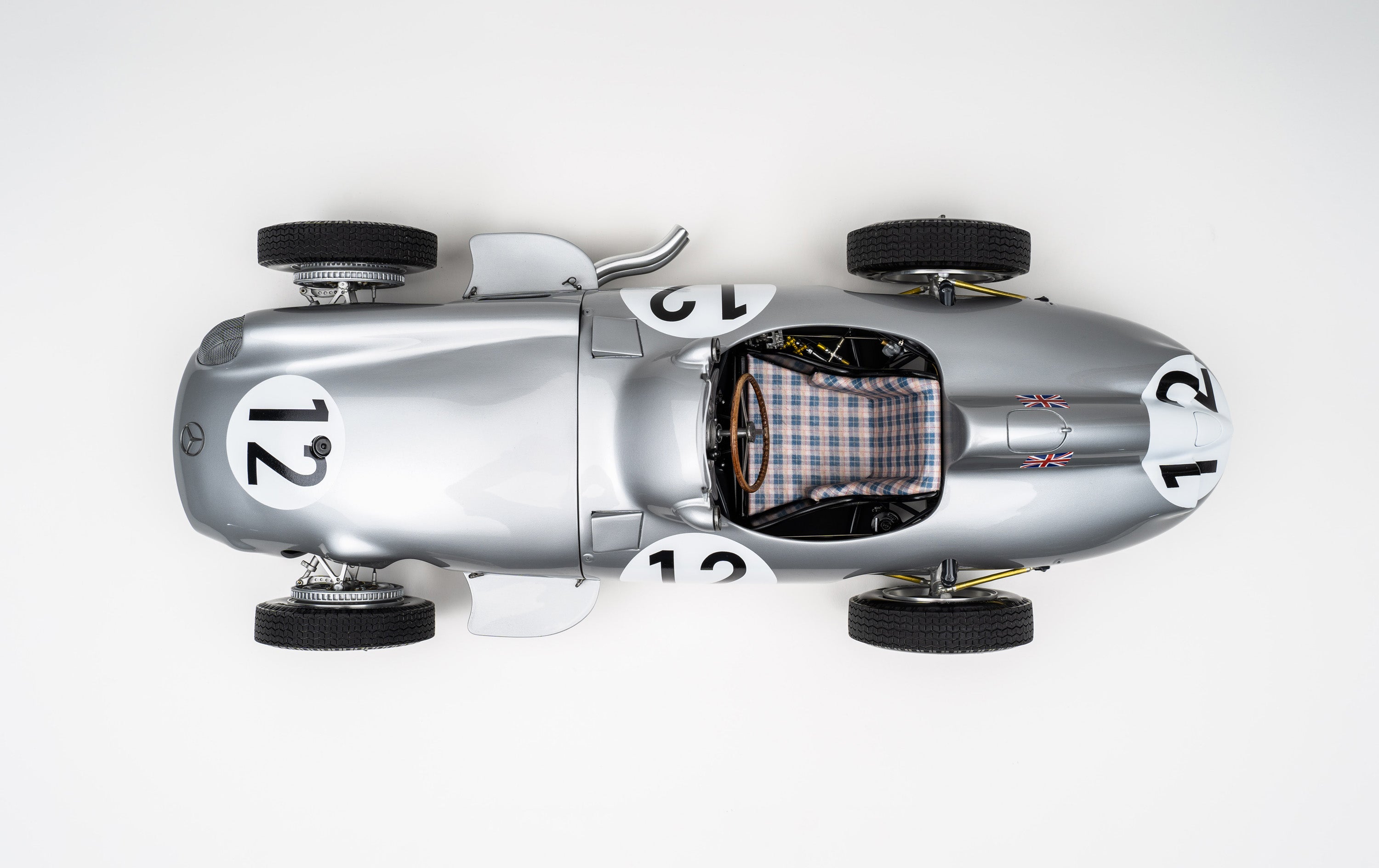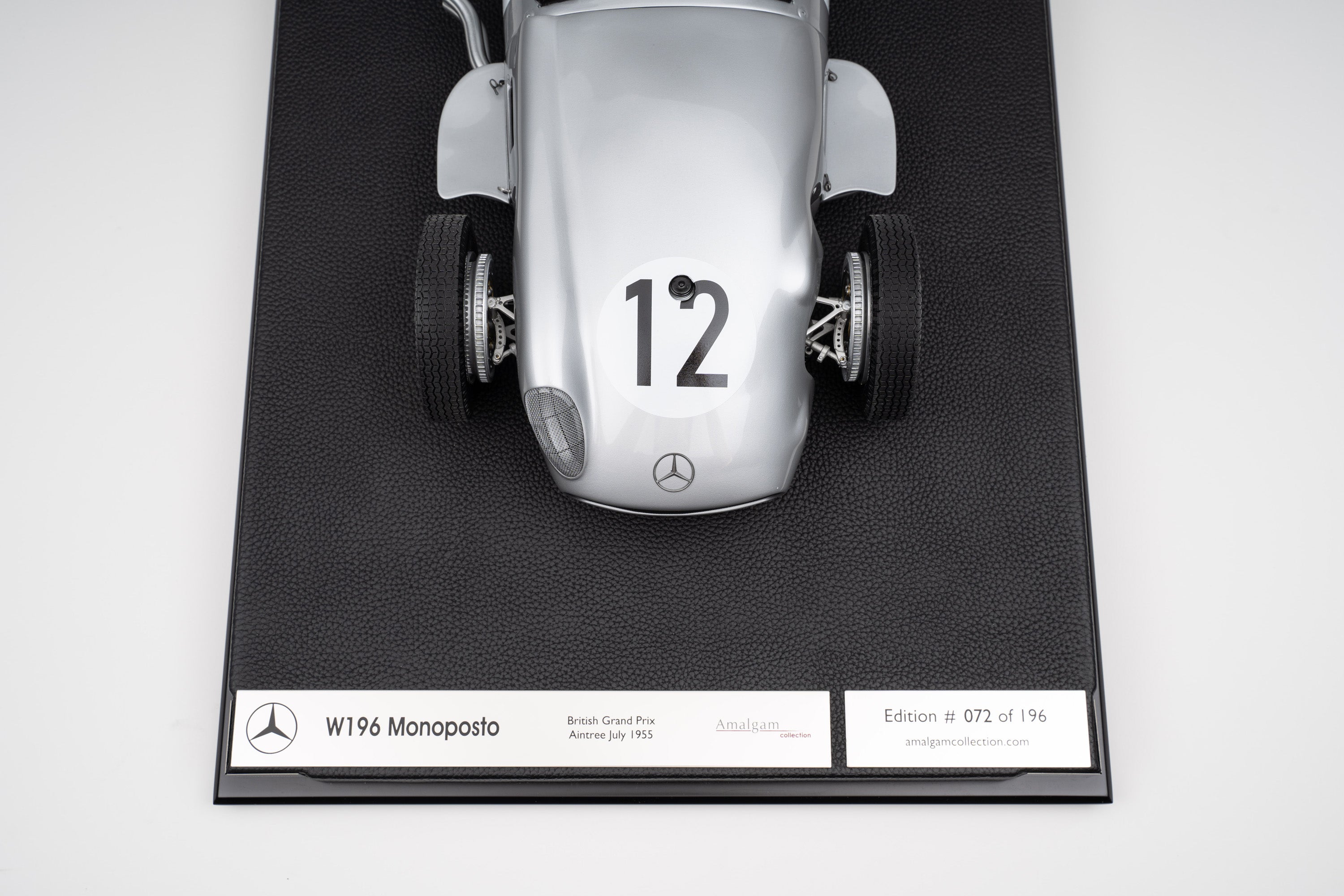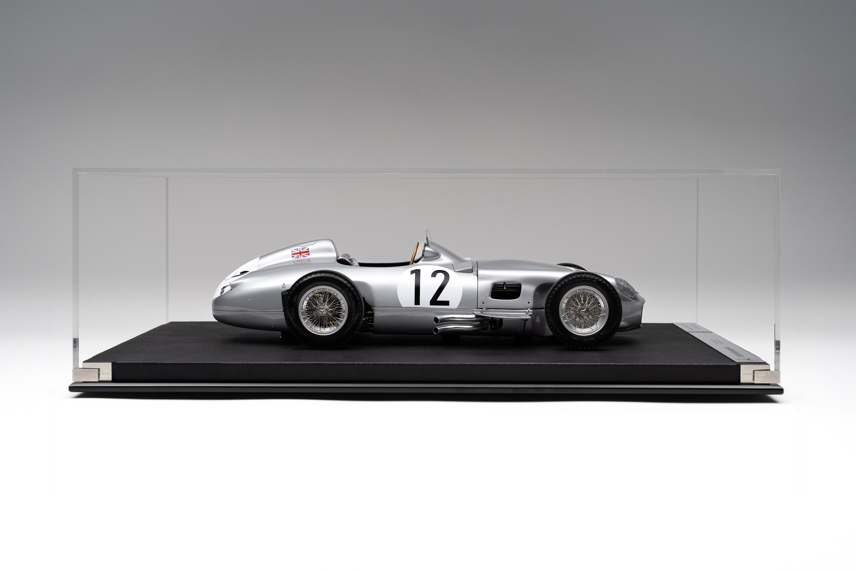 This fine 1:8 scale model is of the Mercedes-Benz W196 Monoposto as raced during the British Grand Prix at Aintree on the 16th of July 1955. Sir Stirling Moss led home the W196’s finest hour, a dominating 1-2-3-4 finish, ahead of his Argentine companion, Juan Manuel Fangio. Many, including Moss himself, believed that Fangio allowed his British protégé to claim his debut win in front of his home crowd. This was, however, consistently denied by the newly crowned triple World Champion, who claimed that Moss "was simply faster that day." Due to the curtailing of the Formula 1 season in the wake of the Le Mans disaster, Fangio's points advantage over Moss after the race was sufficient to secure his third World Drivers' Championship.