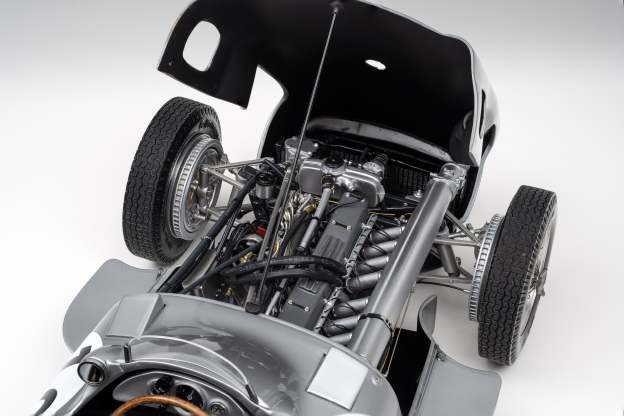 The W196 was the first Formula 1 car to use desmodromic valves to allow the significantly smaller engine to rev higher, as well as the first to use a Bosch-developed fuel injection system, which had already been successfully used on the 300SL racing cars. Adapted from the DB 601 high-performance V12 used on the Messerschmitt Bf 109E fighter, the novel fuel injection system allowed for 257 brake horsepower at the time of its debut, rising to 290 bhp at an impressive 8500 rpm after a year of on-track development. Also carried over from the 300SL was the space-frame chassis, which featured an entirely new approach to chassis building, combining light weight with exceptional rigidity. Sparing no expense, the engineers developed a variety of track specific versions of the W196 with three wheelbases and two interchangeable body styles: the ‘Type Monza’ low-drag streamliner body, designed for high-speed circuits, and the more open-wheel configuration, for the more technical, twisty circuits.